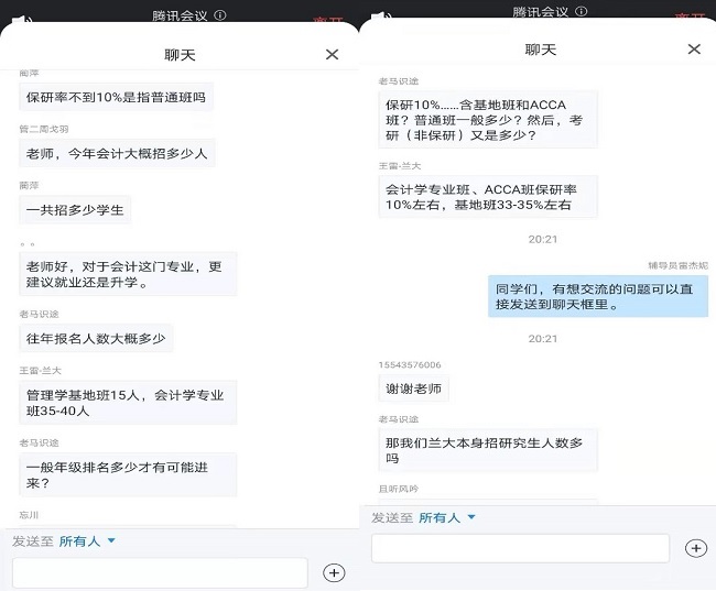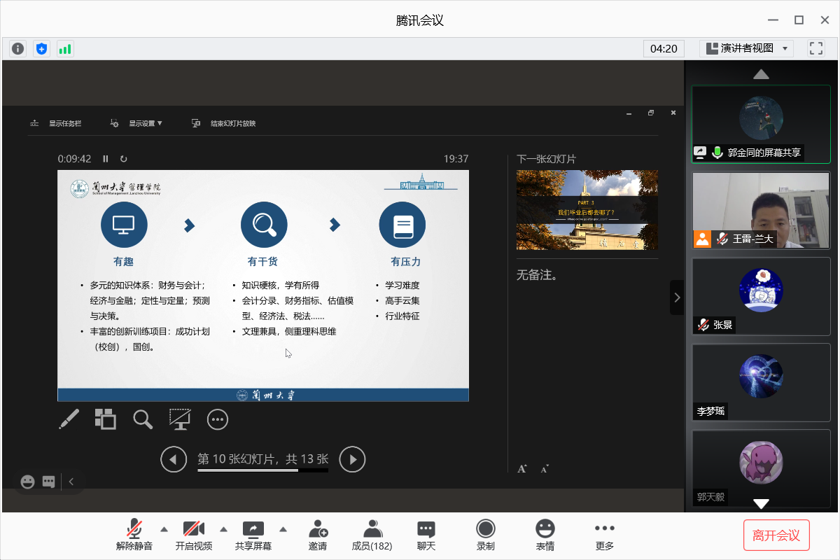 5月13日晚,管理学院举行“本科专业大家谈”讲座——会计学专业,本次讲座以腾讯会议形式召开,讲座由会计系主任王雷副教授主持,参与嘉宾有孙岩教授、校友代表郭金同以及毕业生代表牟逍可和卢嘉瑞,管理学院2020级本科生及部分家长参与本次讲座。
