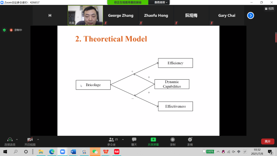 苑春副教授进行了以“Opposing Effects of Bricolage on Efficiency and Effectiveness: Considering The Moderating Role of Dynamic Capabilities”为主题的研究分享。该研究采用350个西北地区中小企业的创业数据,研究创业过程中的资源拼凑(创业拼凑)与不同维度企业绩效之间的关系,包括投资回报率、销售回报率等企业效率方面的绩效,利润增长率、销售增长率、市场份额增长率等企业效益方面的绩效。研究发现,创业拼凑对企业效率具有正向影响,但对企业效益具有负向影响。并且,企业整合内外部资源的动态能力能够加强创业拼凑对企业效率的正向作用,削弱创业拼凑对企业绩效的负向作用。该研究为理解创业拼凑对于不同维度企业绩效的影响提供了一个理论视角来,并且通过引入动态能力,为企业灵活应用创业拼凑提供了参考。随后,张哲老师对该研究提出了一些建设性意见和建议。
