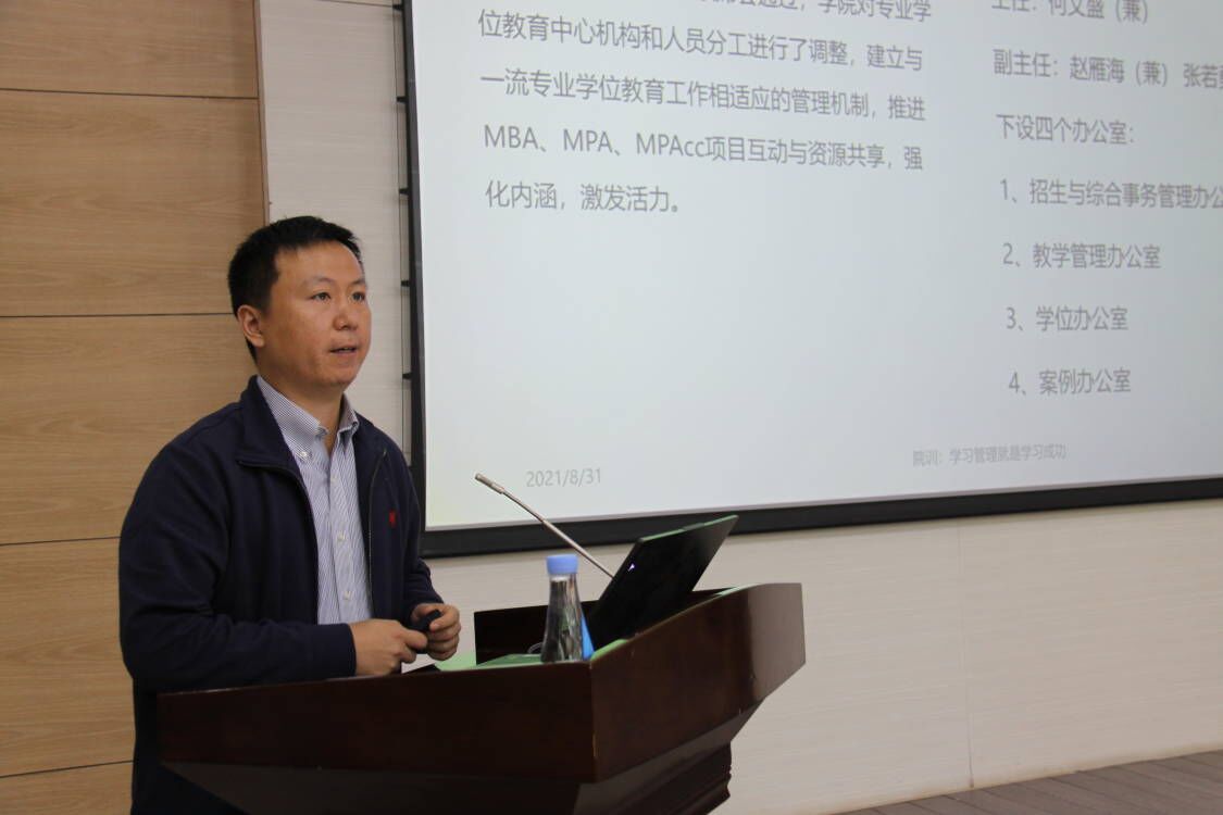 学院专业学位教育中心副主任张若勇从招生、教学、学位、学生活动四个方面回顾了上学期专业学位教育的主要工作,并就本学期专业学位研究生学位和教学工作做了安排。
