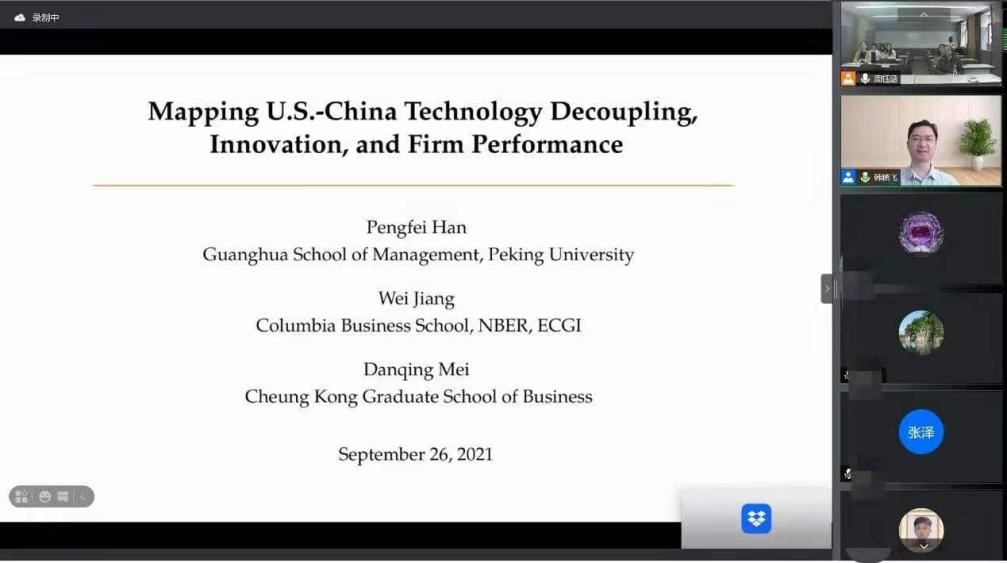 2021年9月27日上午,应管理学院运营与财务管理研究所罗劲博教授邀请,北京大学光华管理学院韩鹏飞博士做客第21期至公会计论坛,以腾讯会议形式开展了题为“Mapping U.S.-China Technology Decoupling, Innovation, and Firm Performance”的精彩学术讲座,讲座由罗劲博教授主持。