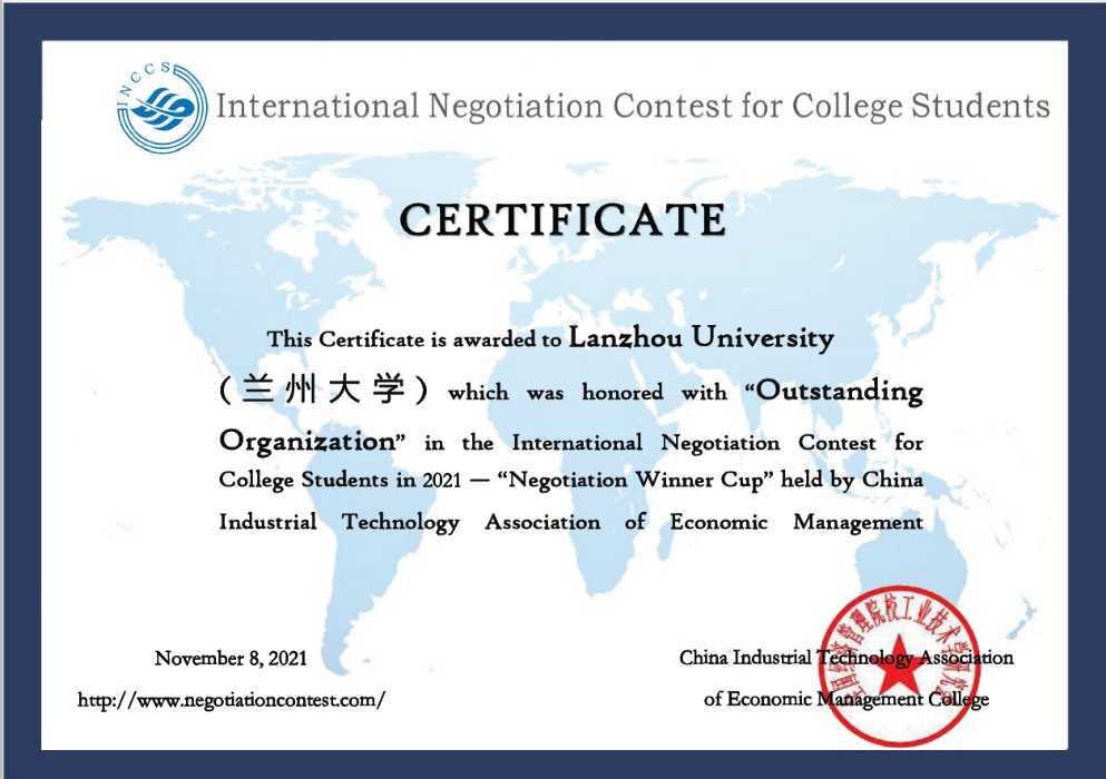 2021年11月12日,由全国经济与管理院校工业技术学研究会沟通与谈判委员会主办,江西财经大学工商管理学院承办,TNC (The Negotiation Challenge)、ABC (Association for Business Communication)、KANS (Korean Association of Negotiation Studies)、Australia China Culture Foundation协办的2021 INCCS落下帷幕。大赛由德国莱比锡大学教授、国际商务谈判挑战赛创始人Remigiusz Smolinski,美国肯塔基州立大学教授、国际商务沟通学会前会长Marcel Robles,美国倾听协会前会长Jennifer (Jennie) Grau,美国威斯康星大学白水分校教授Sheryl-Anne (S-A) WELCH等担任国际评委。国内来自中南大学、南京航空航天大学、首都经济贸易大学、天津外国语大学滨海学院、上海对外经贸大学等高校的24支本科生、留学生、研究生代表队同赛道参加。经过两轮激烈角逐,由兰州大学管理学院翁鸿涛老师指导的本科生代表队荣获全国一等奖一项,二等奖5项,优秀谈判手3名,兰州大学同时荣获优秀组织奖。